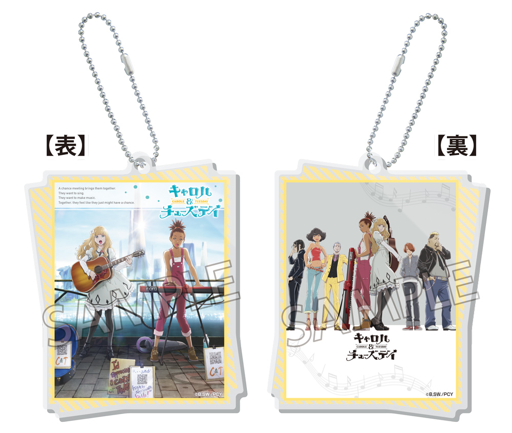 TVアニメ『キャロル&チューズデイ』の魅力的なイラストをふんだんに使用した両面アクリルボールチェーンです。表面はキャロル&チューズデイ、裏面は主要キャラが配置された商品です。